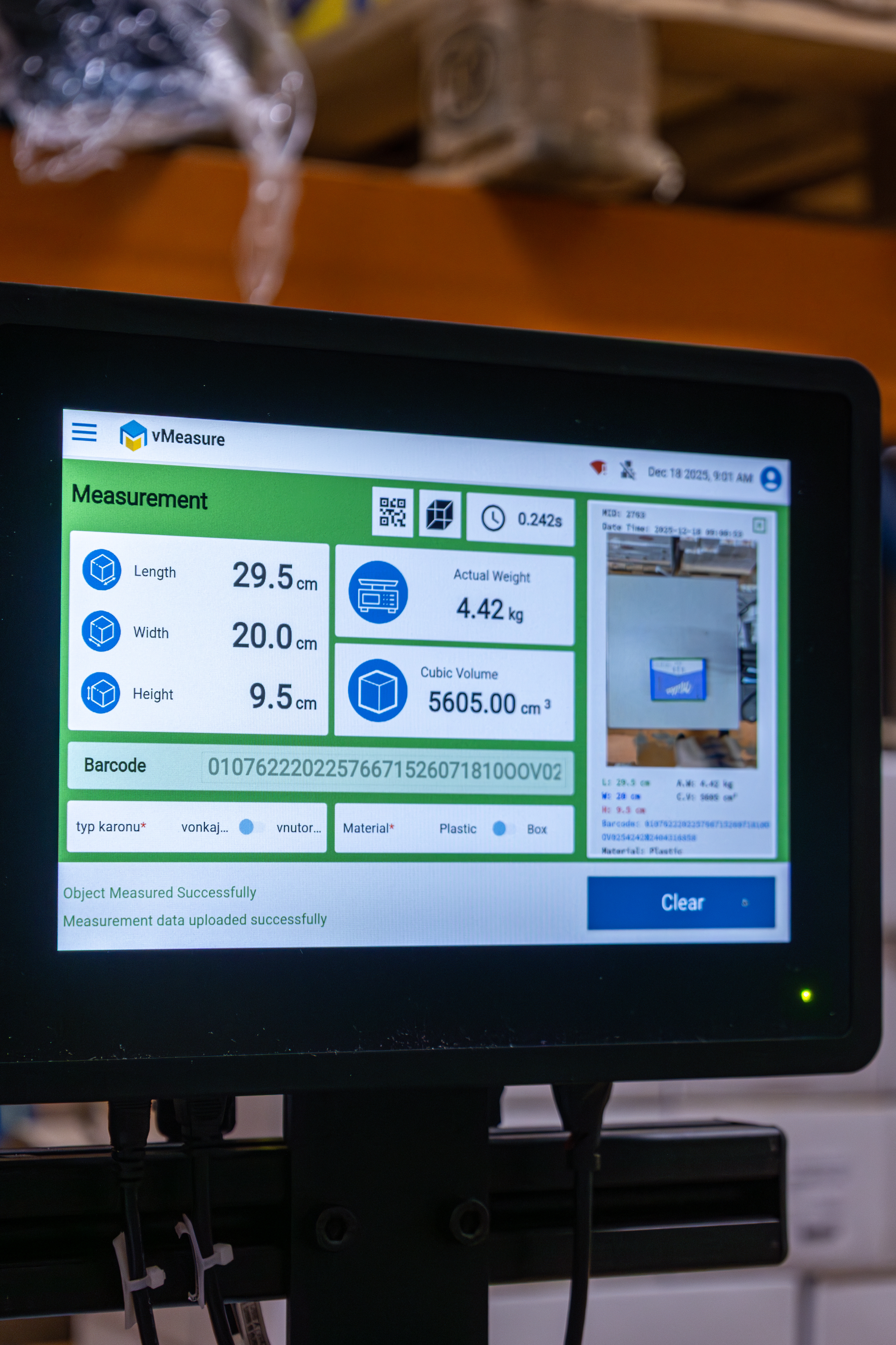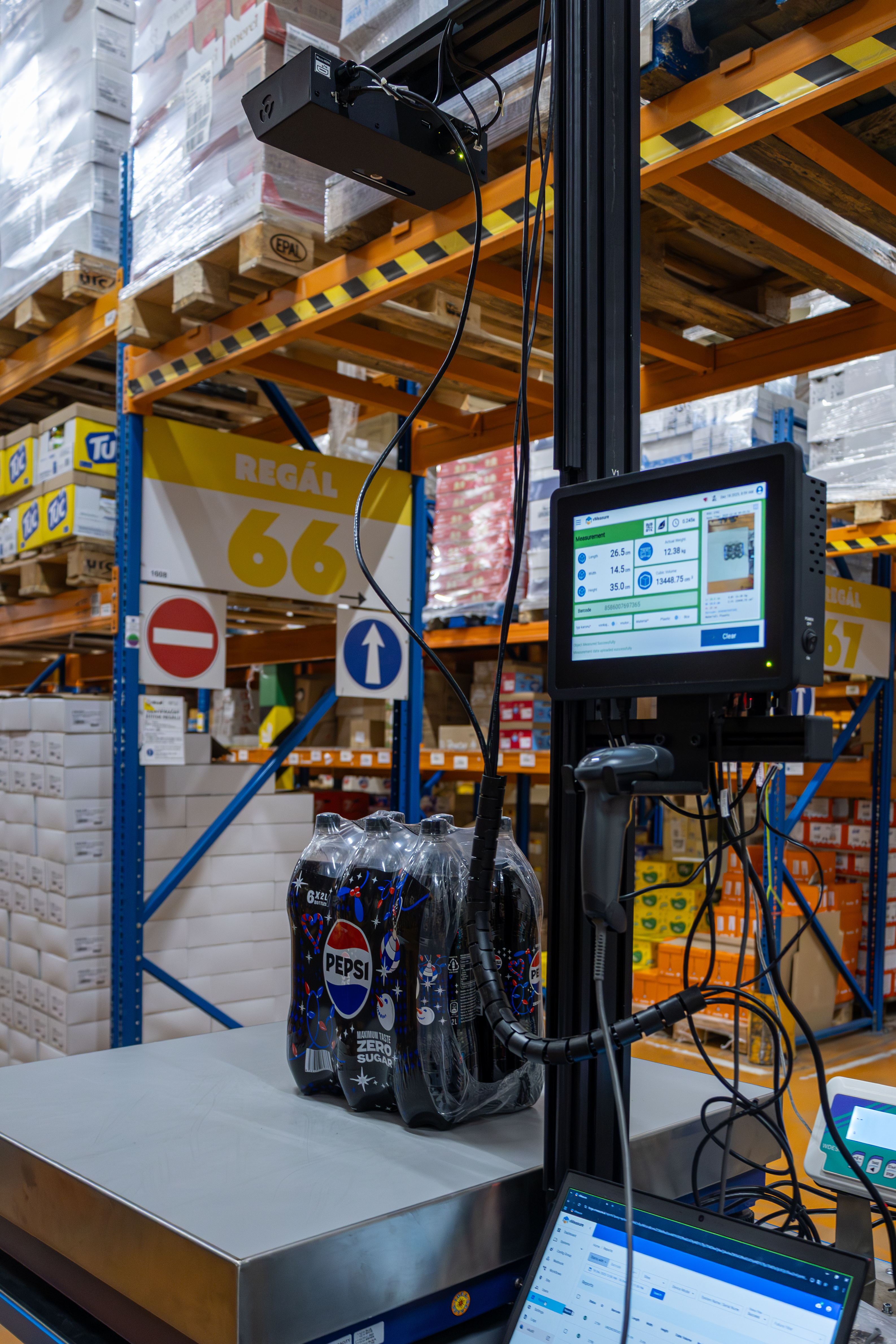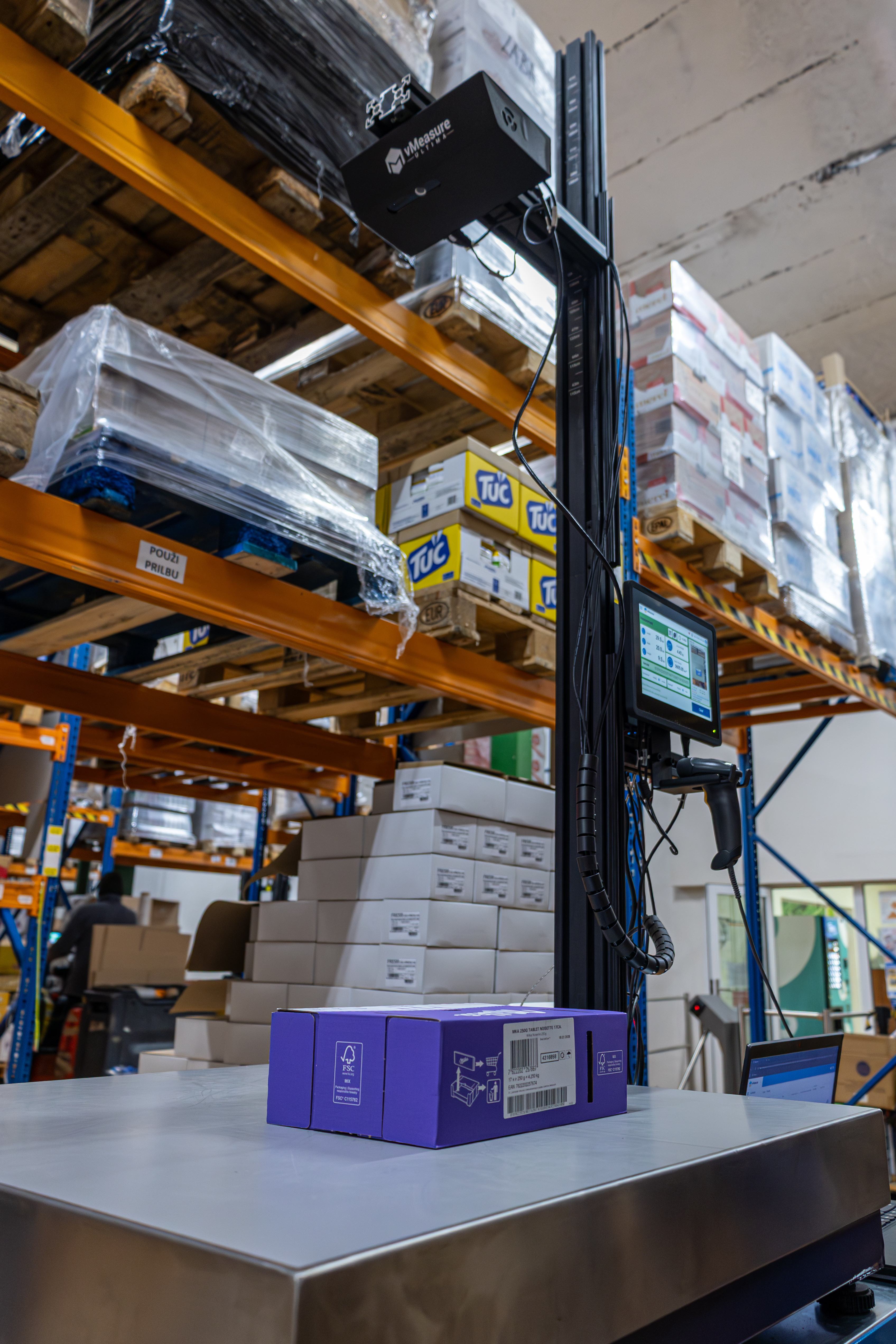 Tento stroj dokáže po naskenovaní čiarového kódu pri každom balení presne odmerať jeho rozmery, hmotnosť a priradiť mu interný kód, ktorý sa následne uloží do systému. V systéme dokážeme presne nastaviť, akú hmotnosť má mať konkrétne balenie. Výsledkom bude výrazné zníženie chybovosti pri vychystávaní tovaru a zároveň odpadne potreba dodatočných kontrol po nabalení celej palety pre zákazníka.